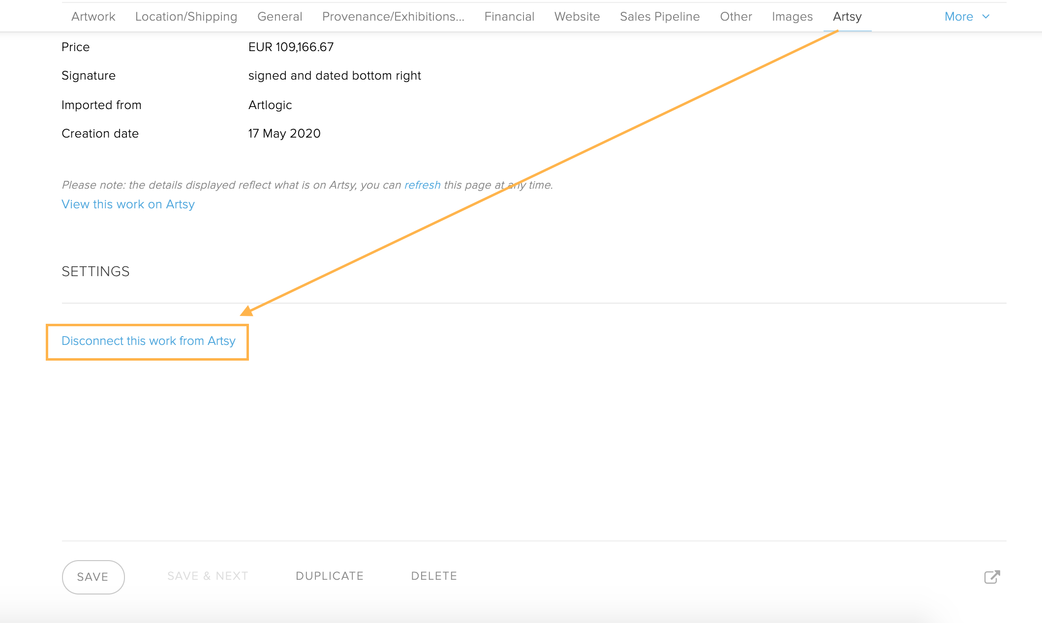 Once you have successfully disconnected the artwork, the next step is to reconnect it by adding the artwork to Artsy directly from the Artsy tab within the artwork record.