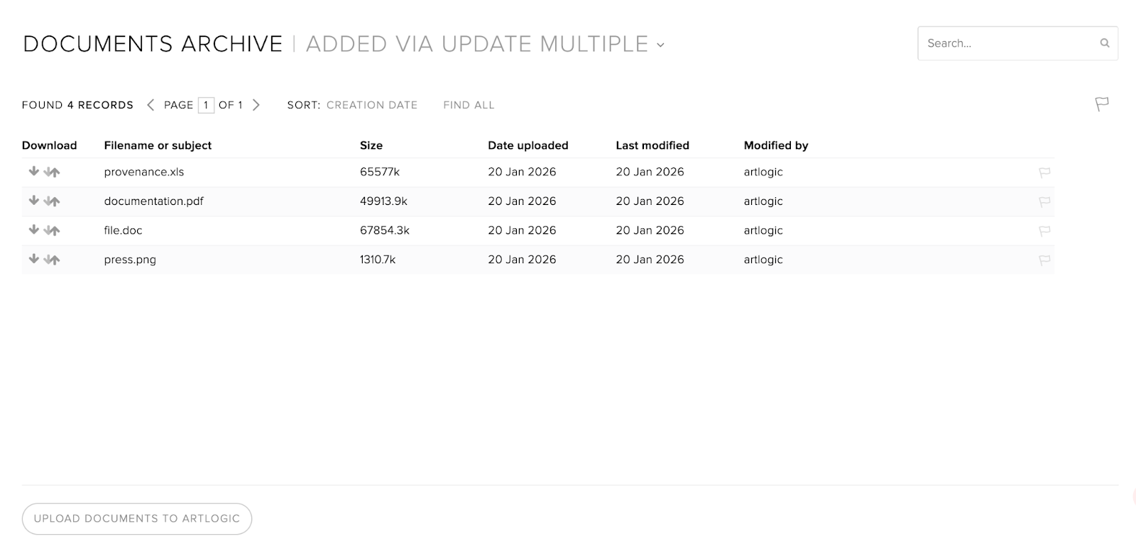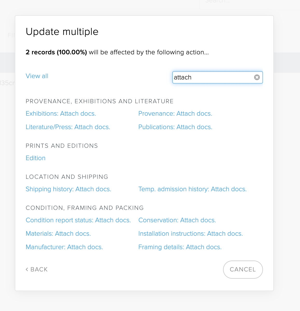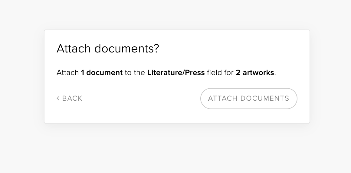 This feature allows users to upload and attach a document (or documents) to multiple artworks in one streamlined process.