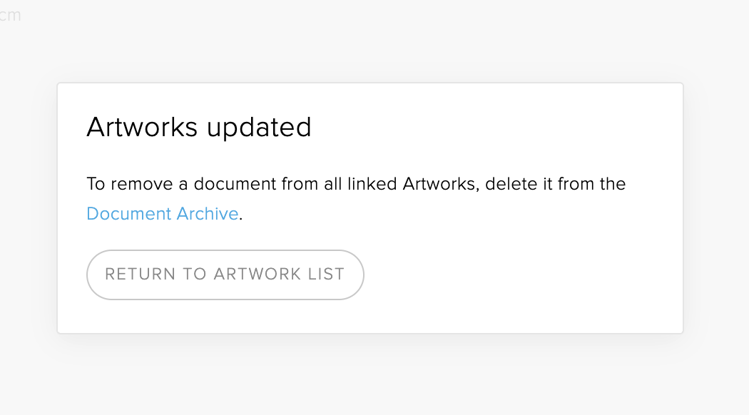 When complete, Artlogic will confirm that the documents have been attached. Click to go to the Documents Archive (to view all uploaded files) or to Return to the Artwork list.