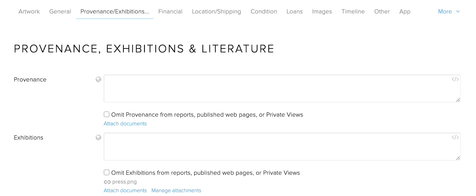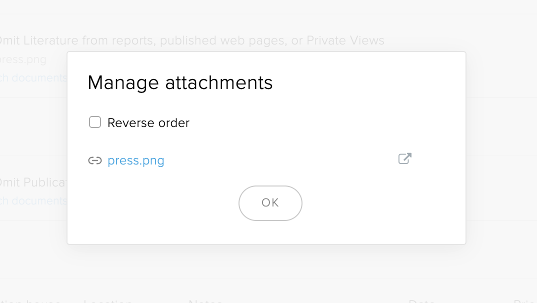 Unified Attachments List:Documents attached via this method appear in each artwork’s attachments list, alongside any files uploaded directly to that record/field.