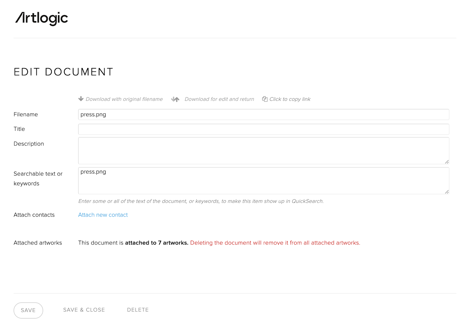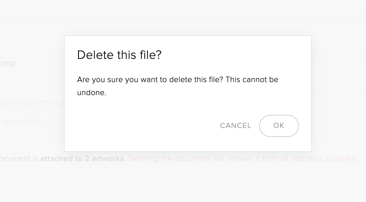 Deleting the file will delete the document from the Documents Archive and remove the Attachment link from all associated artworks. This cannot be undone.