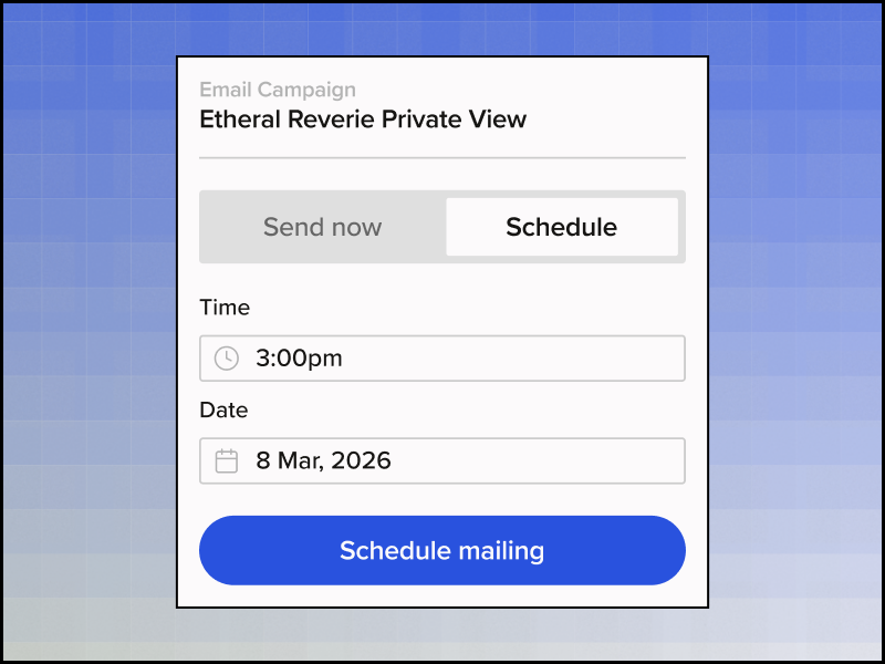 No more waiting at your desk to hit send, you can now schedule a campaign up to a month in advance at a date and time of your choice. Get ahead of your marketing this art fair season.