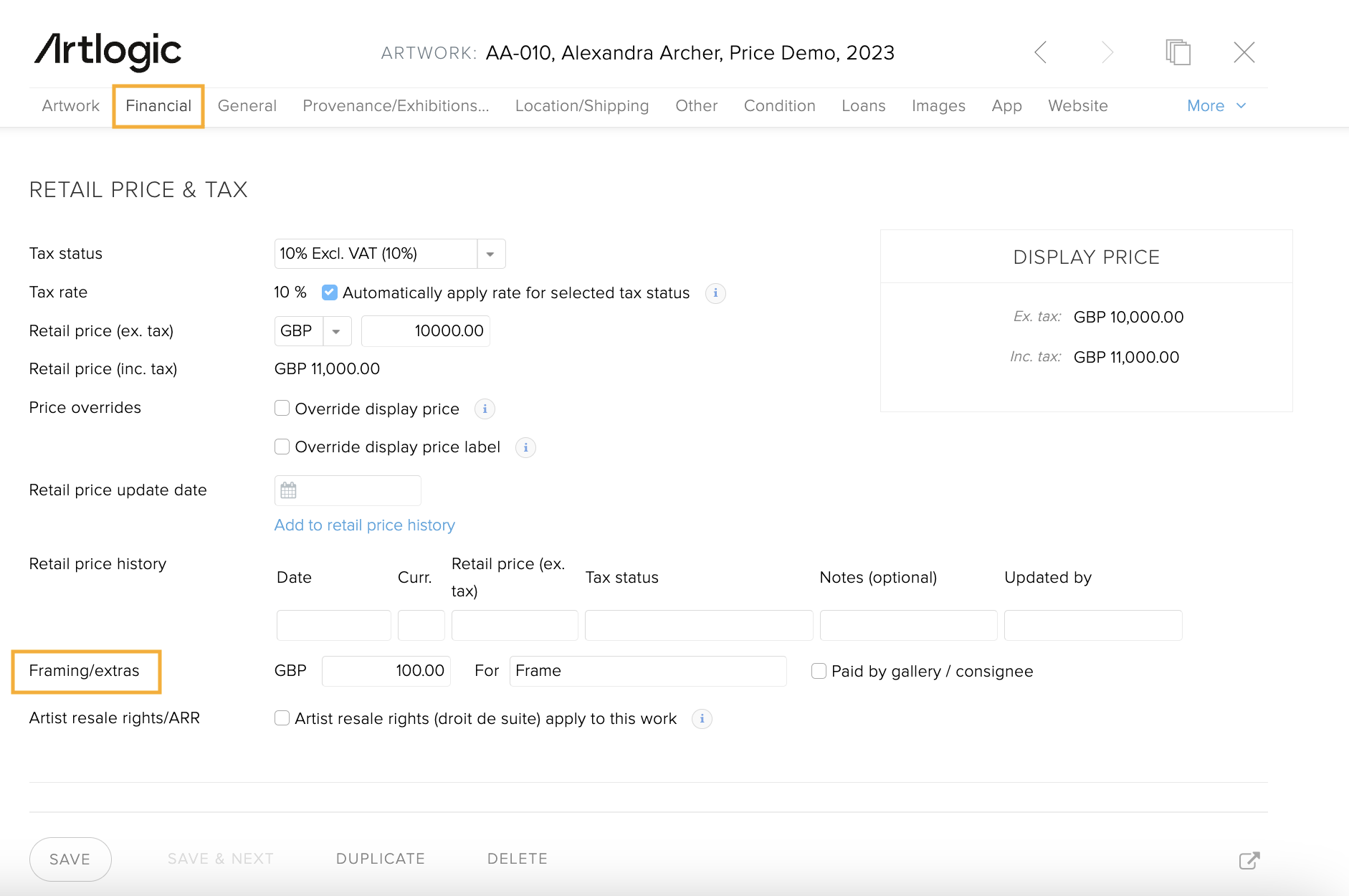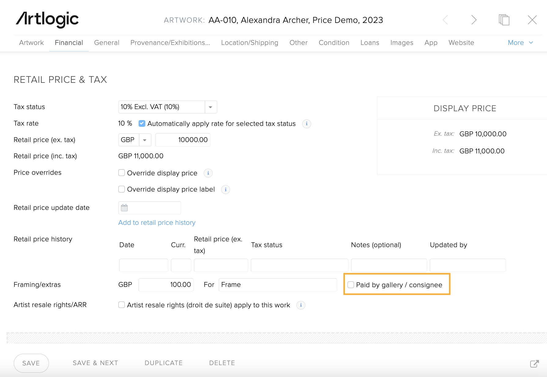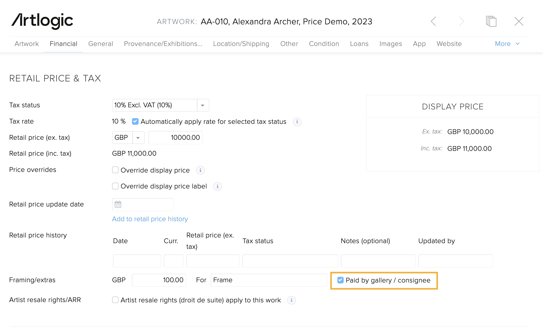 If the artist or consignor paid for the frame and needs to be paid back from the sale proceeds, tick the box 'Paid by gallery / consignee' under the Retail Price and Tax section.