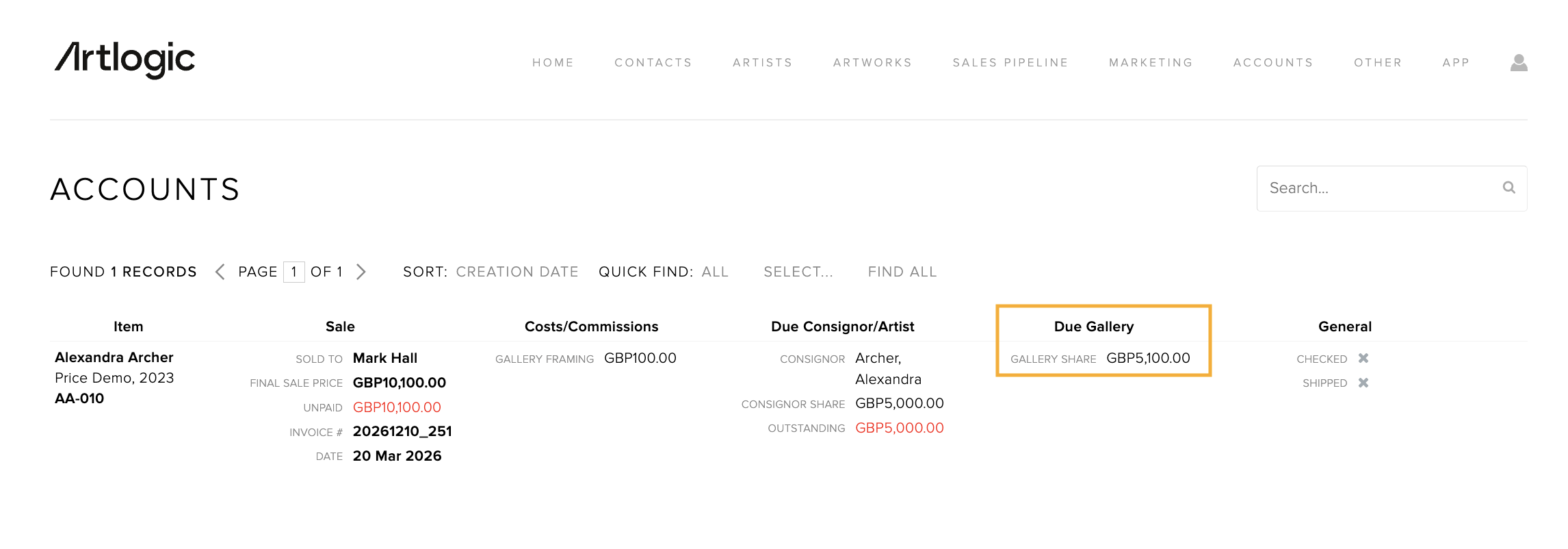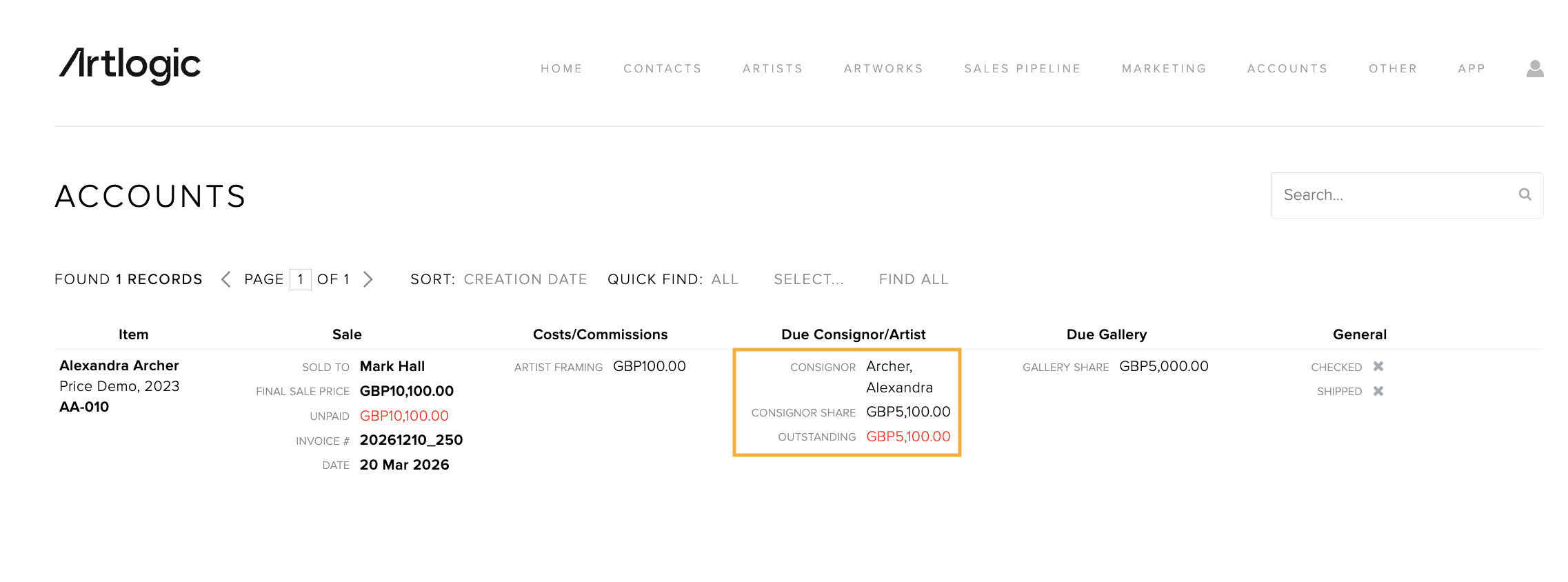 When the work is sold, Artlogic will add this cost to the amount owed to the consignor in the associated Account Record.