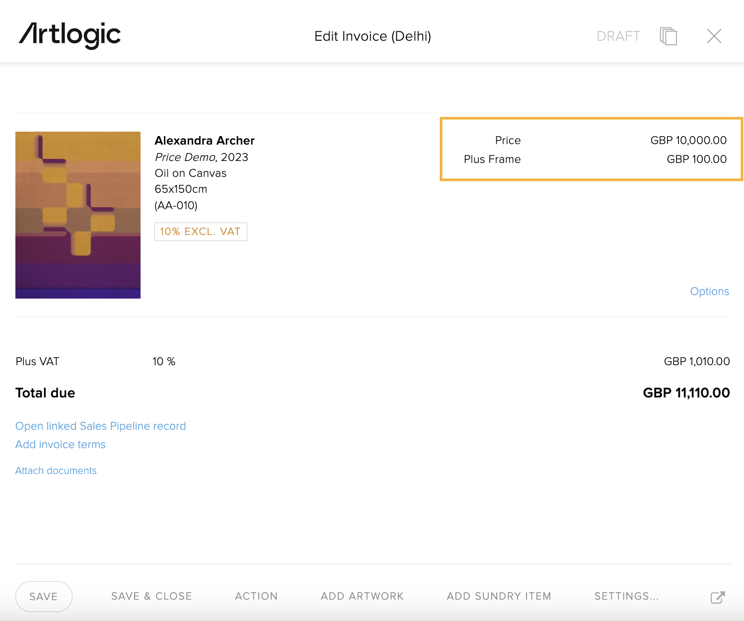 When you generate an Artlogic invoice for this artwork, the system will automatically provide a transparent breakdown for your client.