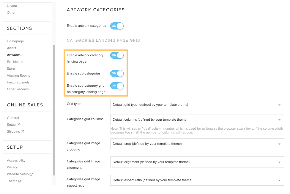 First, log in to your Artlogic website CMS and make sure you have enabled Artwork categories: CMS > Settings > Settings > Artworks > turn on 'Enable artwork categories'.