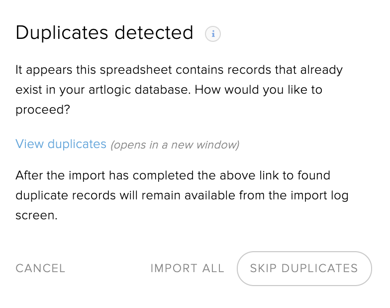 The system will automatically find any records that are already in the system. These duplicates will be available to view in another tab on your browser if you wish to review them before importing your data. You can then decide whether to include these duplicate records in your import or to have the system automatically skip these.