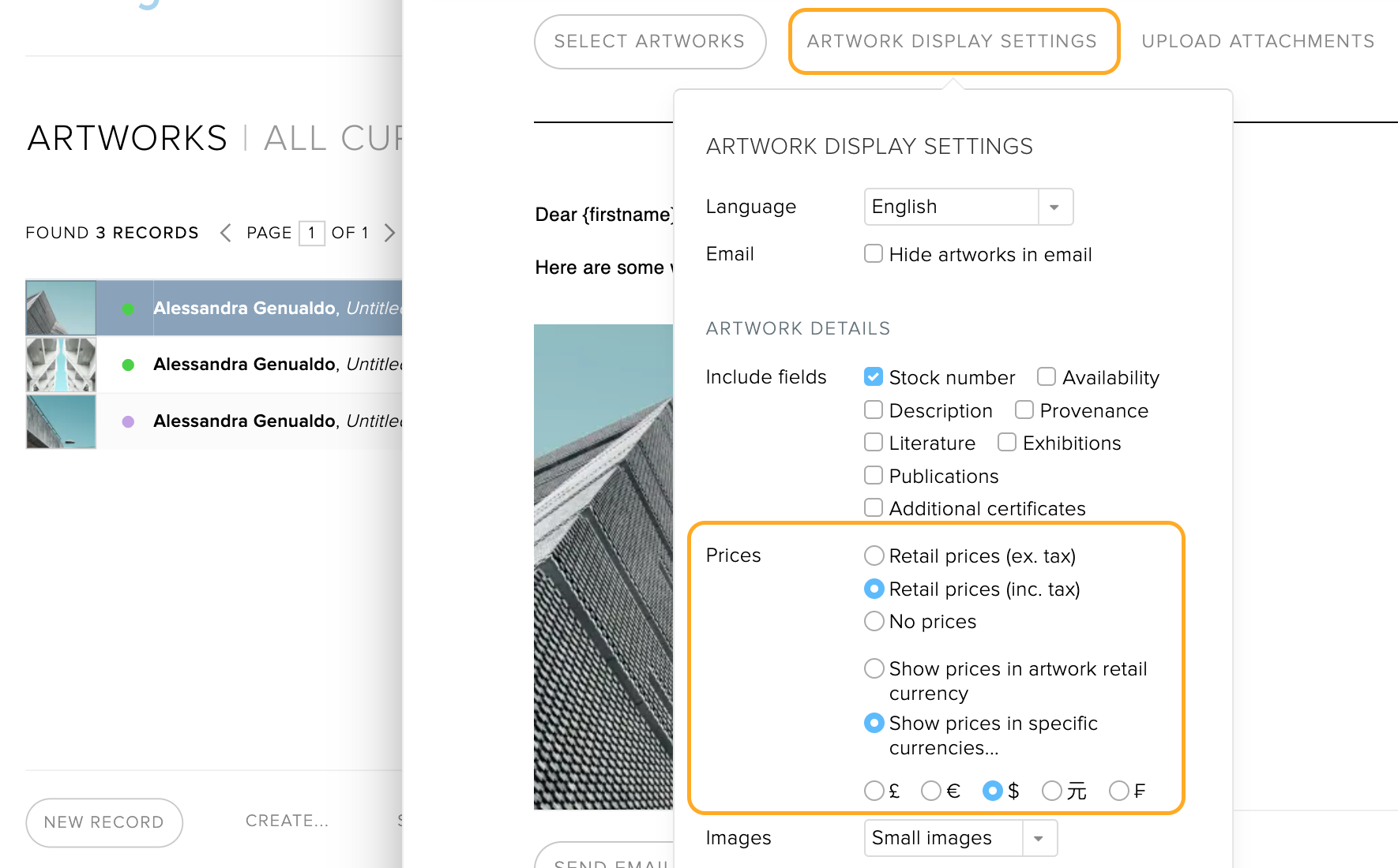 When sending an offer email, you can now select to show artwork prices in either the artwork retail currency, or another specific currency.